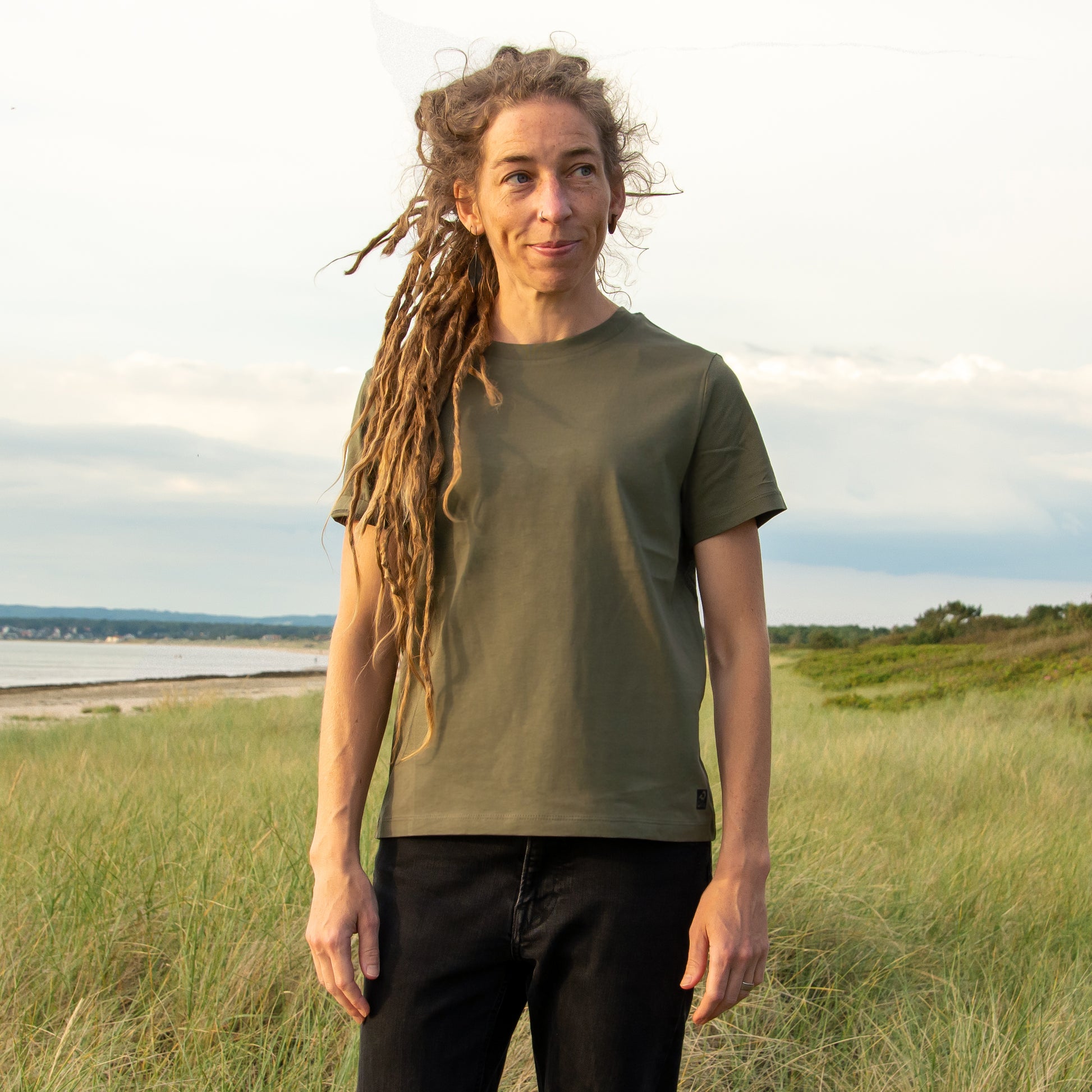 Das bio T-Shirt für Damen in khaki im lockerem kurzen Schnitt und etwas dickerem Stoff (180g/m²) wird von Hand im Siebdruckverfahren im eigenen Atelier in Hannover bedruckt. Die wasserbasierten Textildruckfarben gehen beim drucken direkt in den Stoff. Sie sind dauerhaft und auf der Kleidung nicht spürbar.