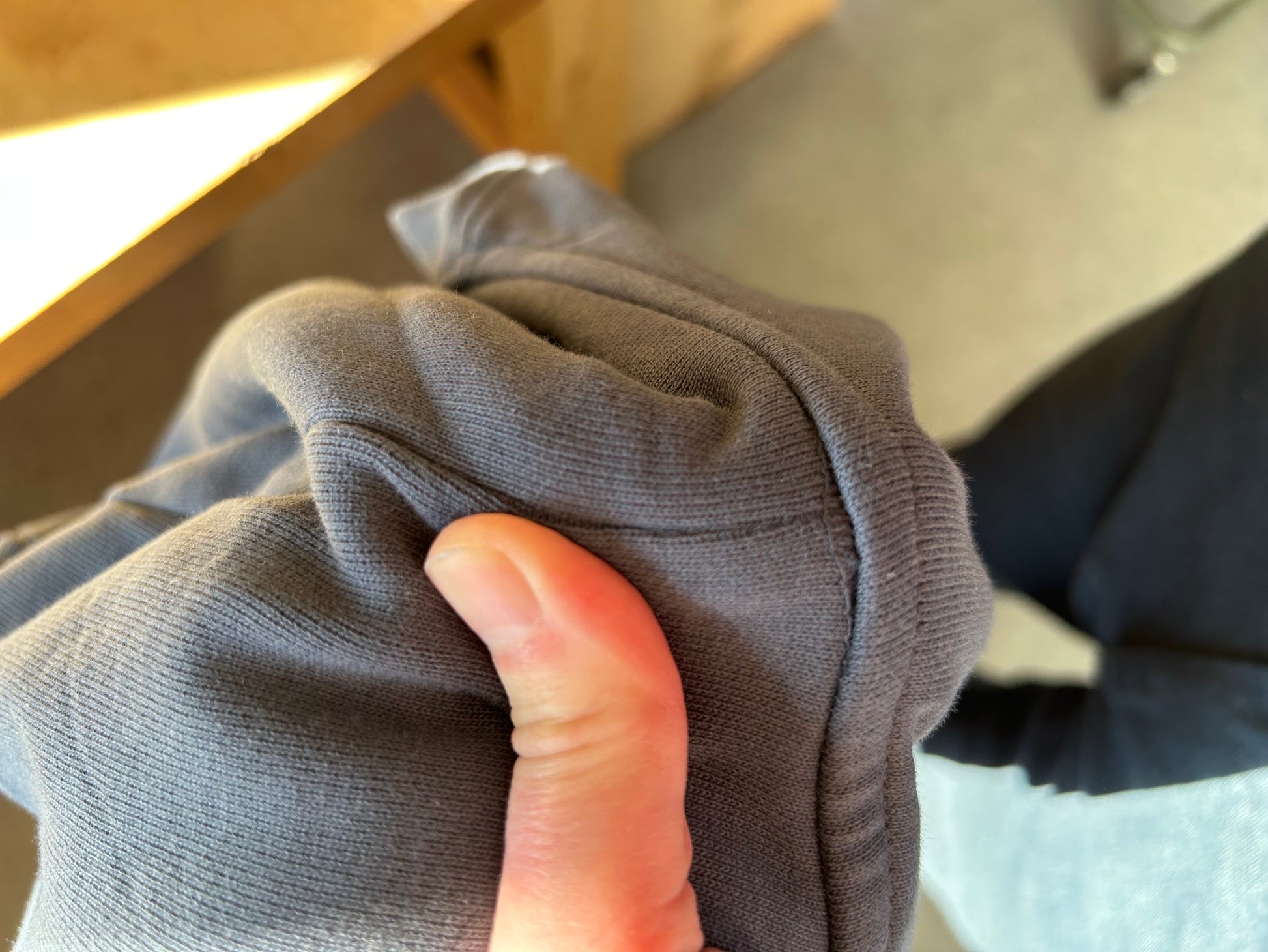 Dieser Hoodie hat einen Fehler im Naht zwischen Kapuze und Pulli. Siehe Bilder 2-4.