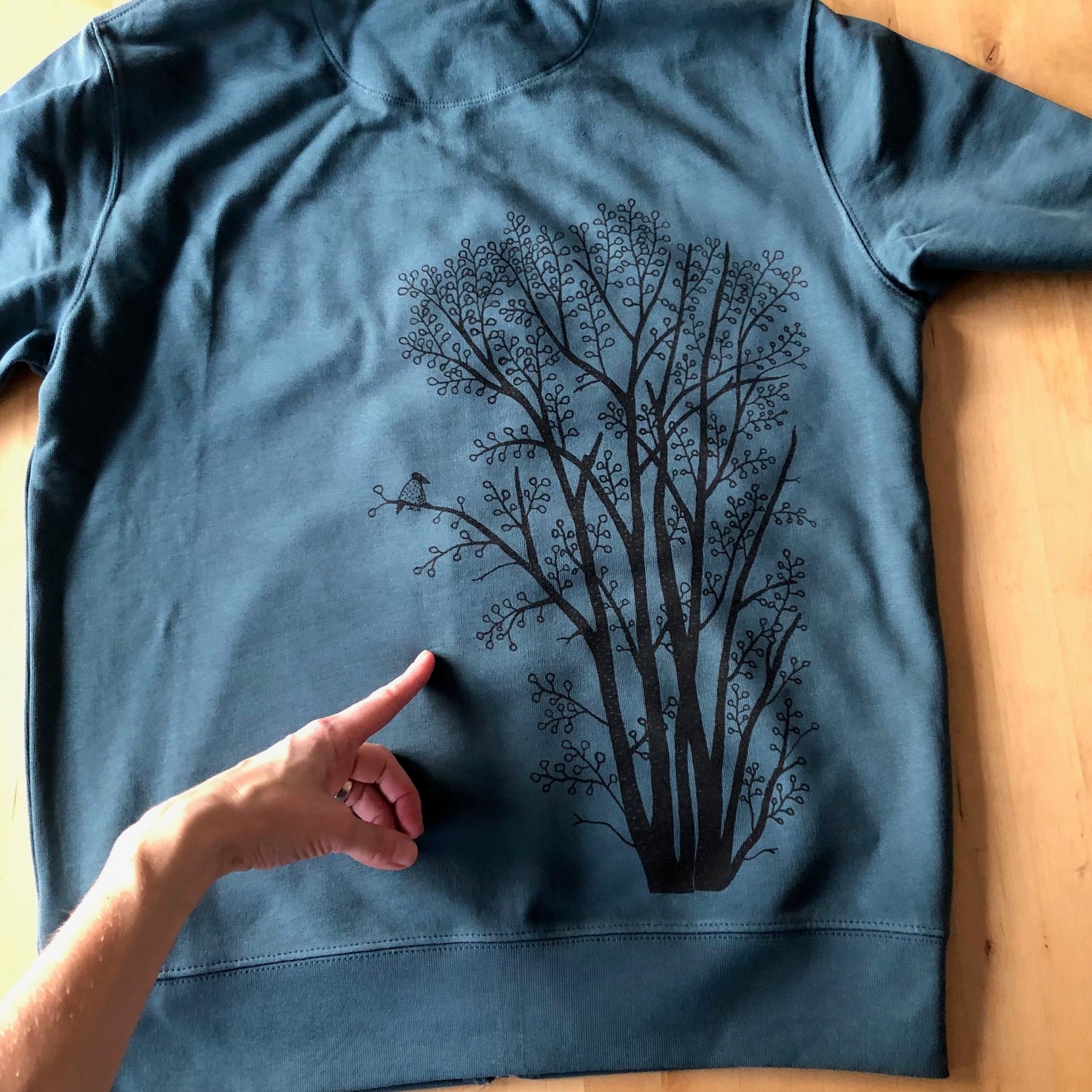 Die Kapuzenjacke begleitet dich durch das ganze Jahr. Der weiche Stoff (350g/qm) ist innen kuschelig aufgeraut. Er ist angenehm zu tragen und hält schön warm. Die Jacke wird im eigenen Atelier in Hannover bedruckt. Die wasserbasierten Textildruckfarben gehen beim drucken direkt in den Stoff. Sie sind dauerhaft und auf der Kleidung kaum spürbar.