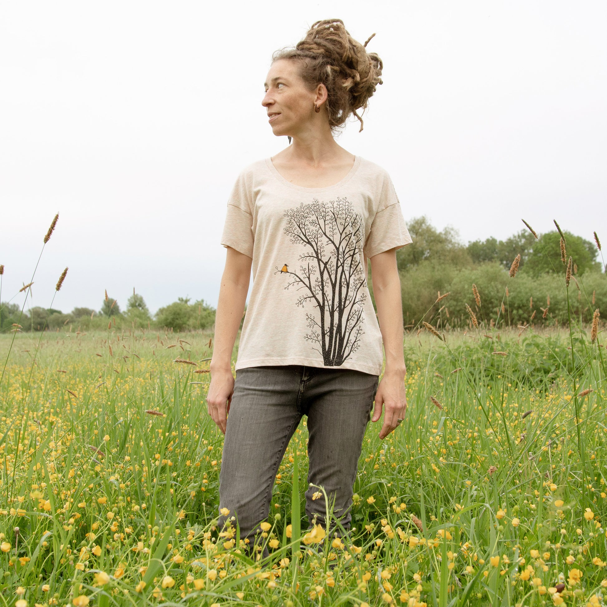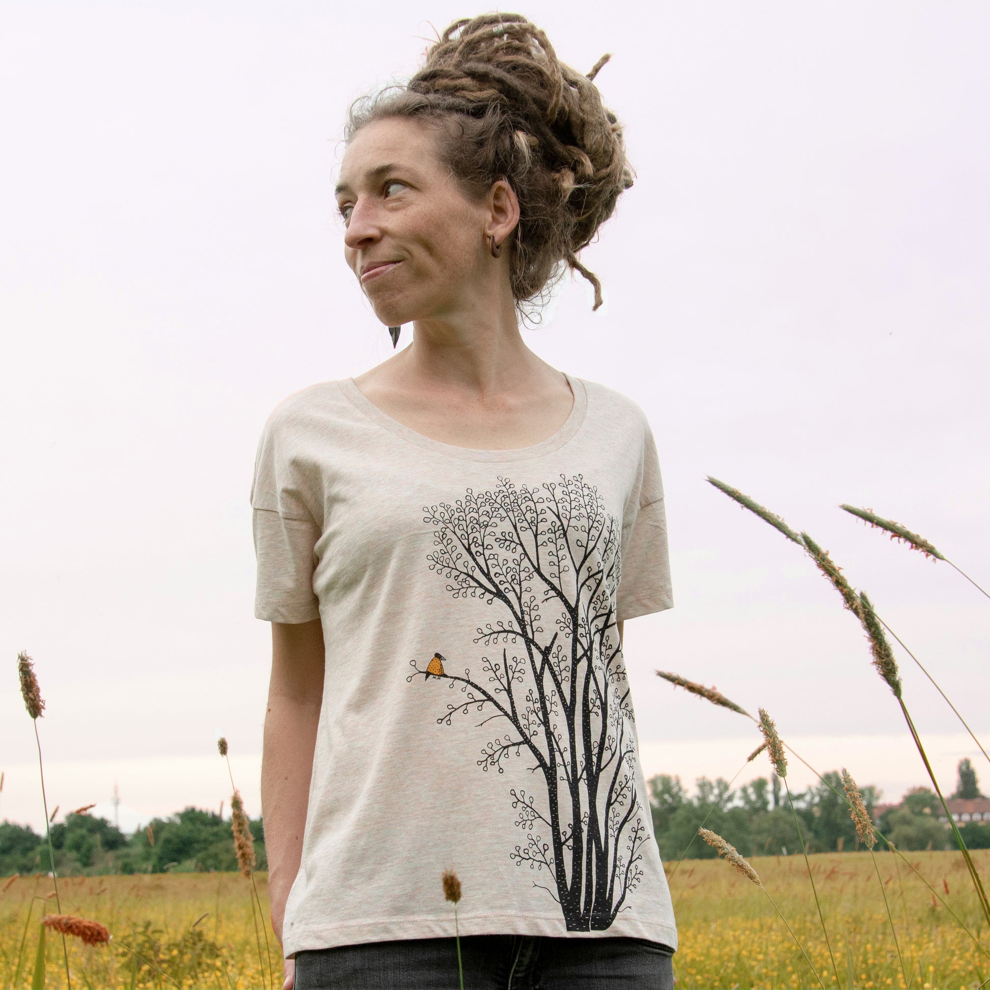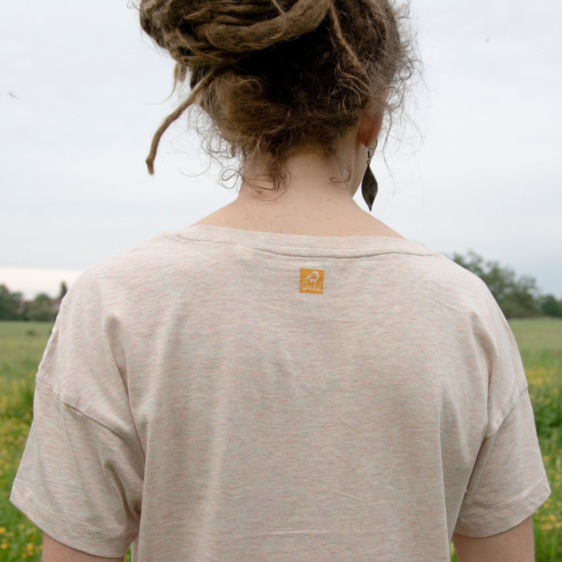 Das bio T-Shirt mit lockerem kurzen Schnitt wird von Hand im Siebdruckverfahren im eigenen Atelier in Hannover bedruckt. Die wasserbasierten Textildruckfarben gehen beim drucken direkt in den Stoff. Sie sind dauerhaft und auf der Kleidung nicht spürbar.