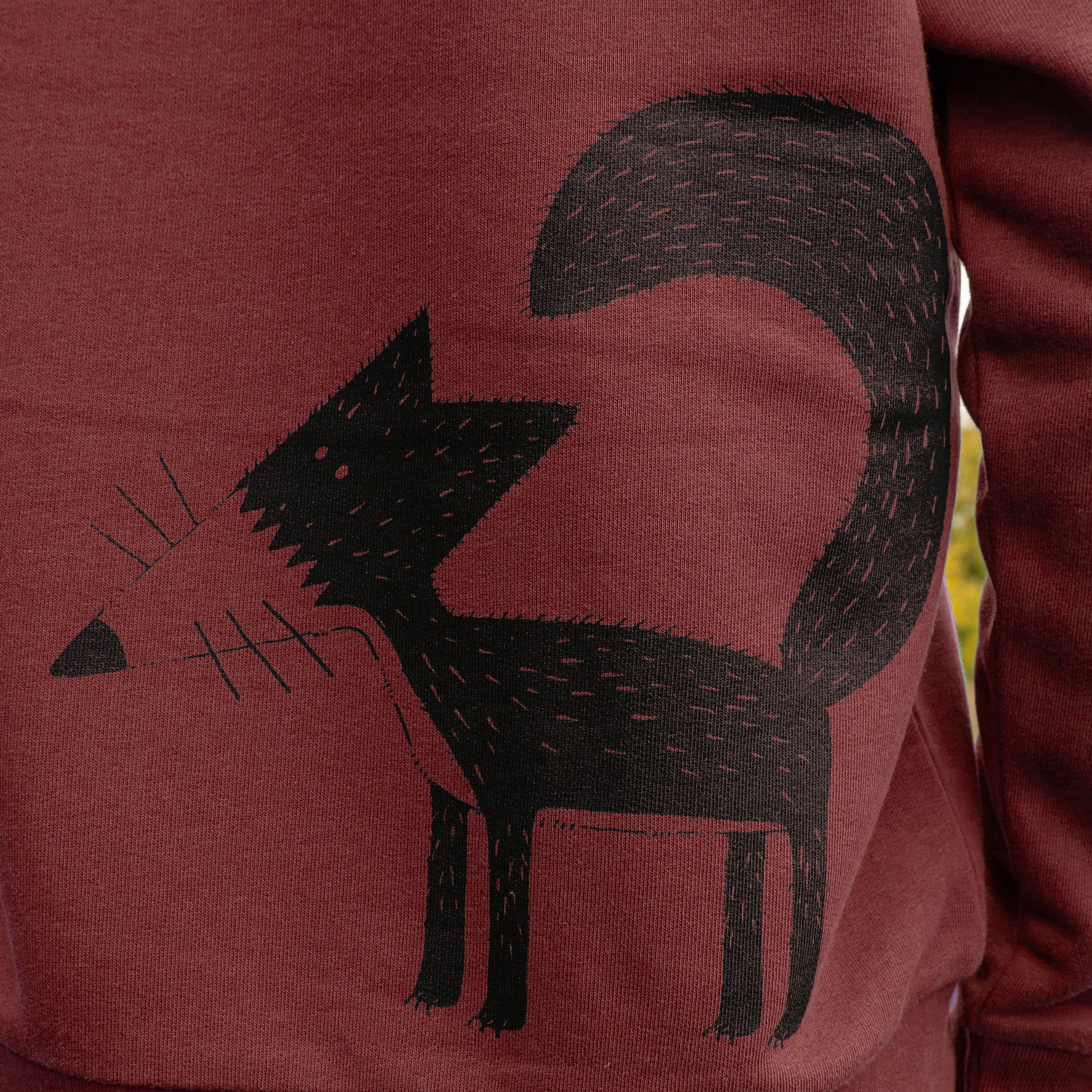 Die Kapuzenjacke begleitet dich durch das ganze Jahr. Der weiche Stoff (350g/qm) ist innen kuschelig aufgeraut. Er ist angenehm zu tragen und hält schön warm. Die Jacke wird im eigenen Atelier in Hannover bedruckt. Die wasserbasierten Textildruckfarben gehen beim drucken direkt in den Stoff. Sie sind dauerhaft und auf der Kleidung kaum spürbar.