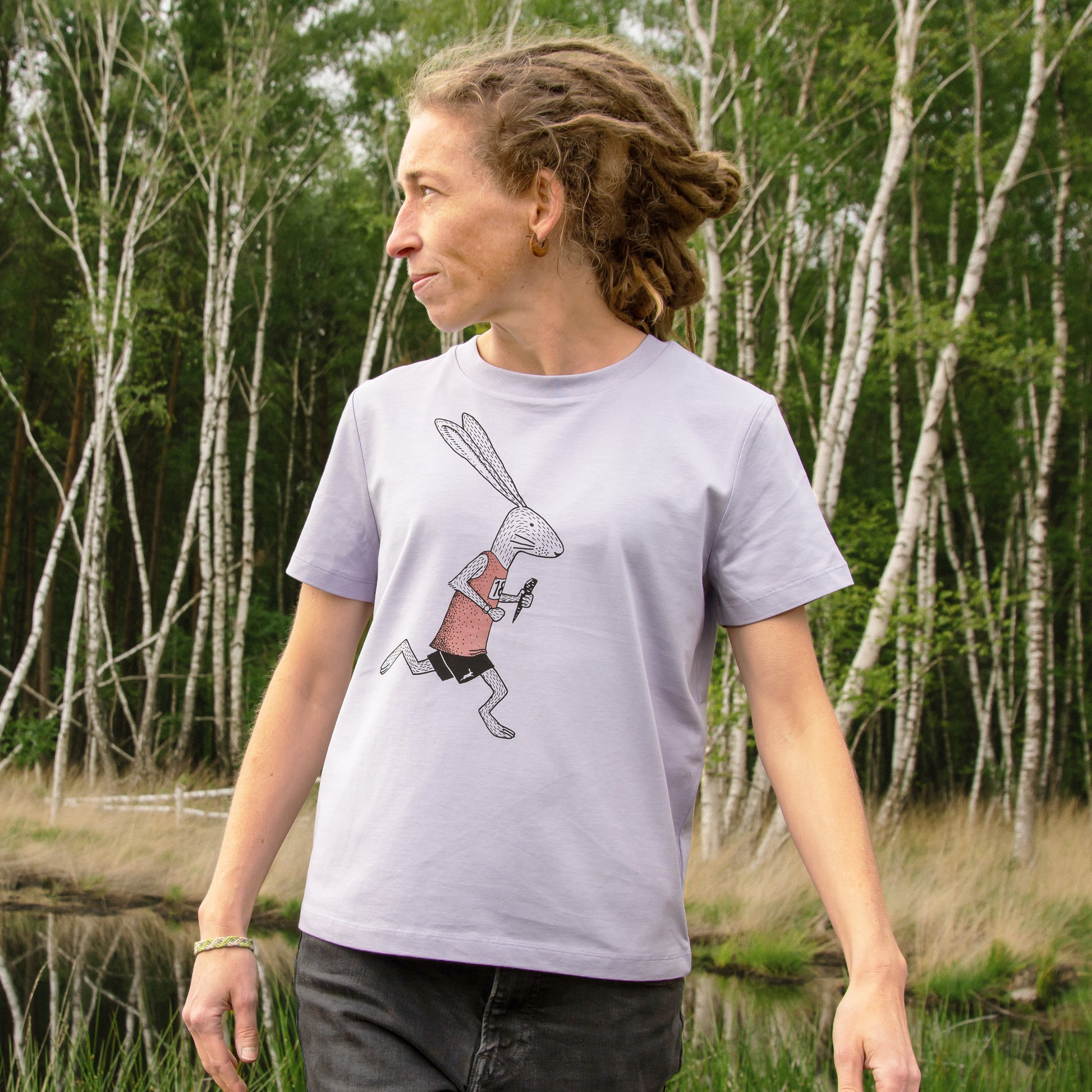 Das bio T-Shirt für Damen "Laufhase" im lockerem kurzen Schnitt und etwas dickerem Stoff (180g/m²) wird von Hand im Siebdruckverfahren im eigenen Atelier in Hannover bedruckt. Die wasserbasierten Textildruckfarben gehen beim drucken direkt in den Stoff. Sie sind dauerhaft und auf der Kleidung nicht spürbar.