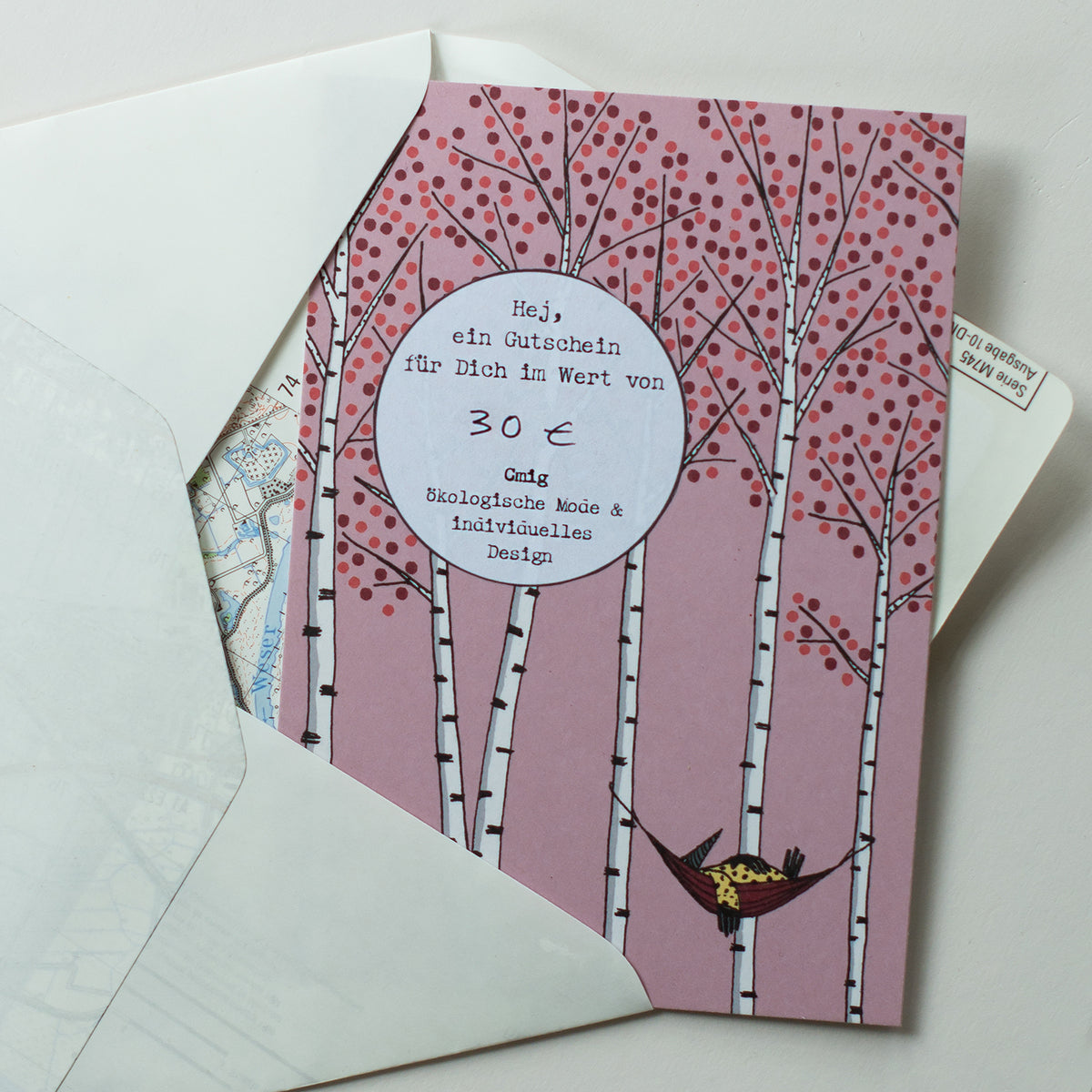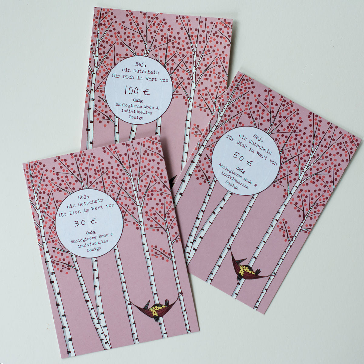 Mit dem Gutschein von Cmig kann die oder der Beschenkte, sein Lieblingsteil selbst auswählen. Der Gutschein wird per Post an die angegebene Wunschadresse verschickt. Gerne schicken wir den Gutschein auch per Mail. Schreib uns einfach eine Nachricht an Cmig@Cmig.se.
